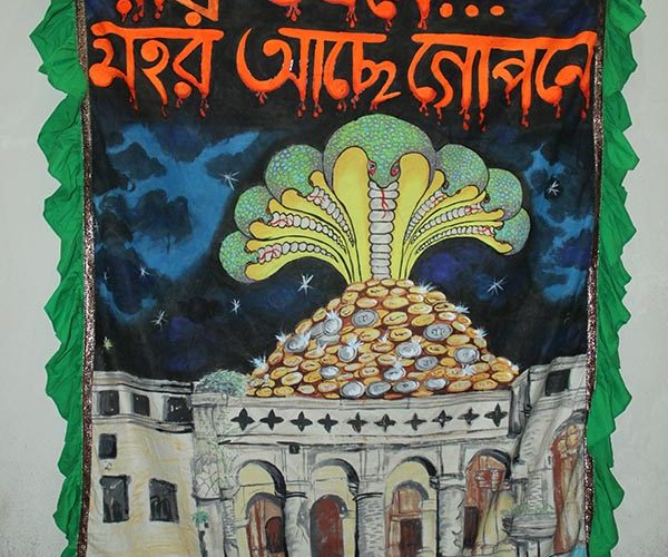 Satirical painting by Baloram Debnath during the 7th episode of Uronto residential art exchange program at Shukhair, Sunamganj, BD. Baloram’s works resemble the narration and interpretation of popular