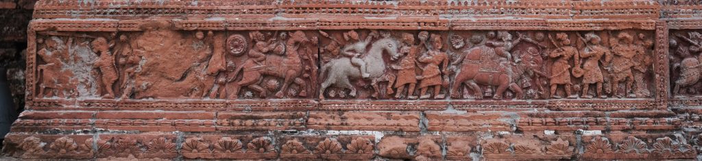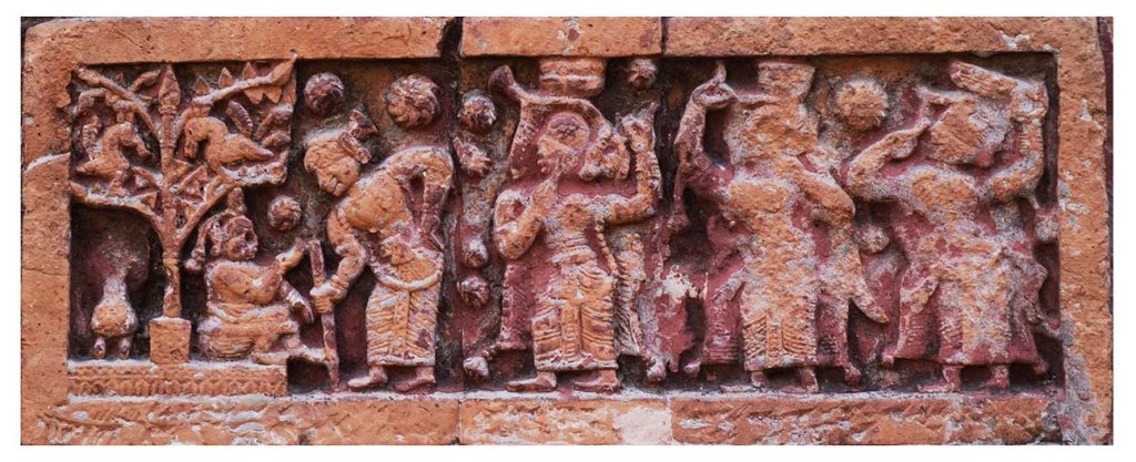 The subjects engraved on the fruit were various animals, beasts, reptiles, various gods and goddesses and the society of that time. The terracotta plaques of this indigenous tradition continue to be painted in the building ornaments even during the medieval sultanate rule after antiquity. The sultans used a large number of terracotta plaques in the ornaments of the mosques built as religious architecture. Needless to say, the numbness in the ancient terracotta plaques was removed during the Muslim rule and it became a masterpiece. Abstract portraits, such as twisted herbs, hanging lamps, grape designs, trees, floral designs, various geometric designs, etc., have been replaced by figurative or living symbols, and the terracotta plaque has reached the pinnacle of industrial development. But after the arrival of the Mughals, they gradually avoided the terracotta plaques as ornaments in the mosques built by them and used only plaster and cut plaster ornaments, carvings and niches. At that time, however, terracotta plaques were found in temples built under the patronage of local Hindu zamindars, and it flourished. The use of terracotta plaque is observed in the ornaments of most of the temples built during this period. And the religious texts, the mythological epics Ramayana and the various events of the Mahabharata are beautifully presented as the subject matter of the illustrations as well as an attempt is made to present a perfect reflection of the social system of that time.