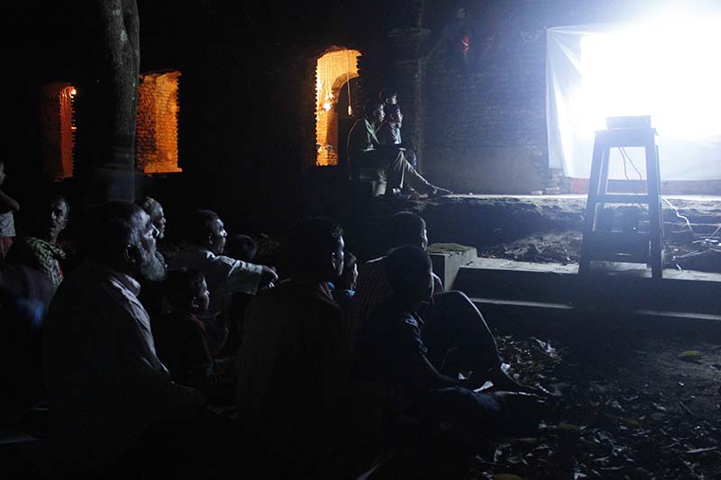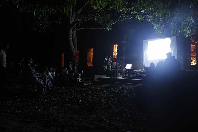 There used to be theater stage at the backyard of Kalikanando Chattopadhyay’s house. Theater show were held at this almost ruined place presently. The artists have used that platform to play a film ‘Jalsaghar’ by a projector to recall the memory of the past and to recall the fact that it was a place of entertainment and gatherings. It’s an attempt to recreate a past moment where the villagers used to gather to enjoy theatrical shows with the family members.