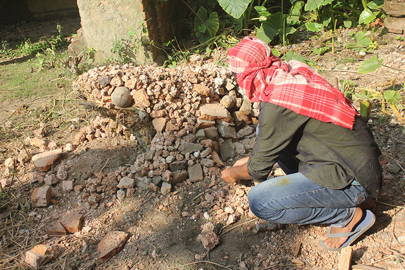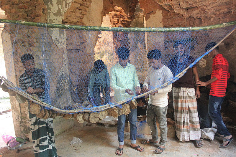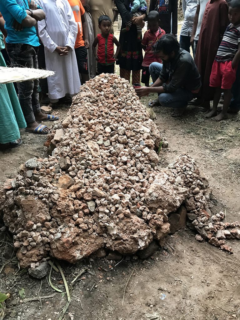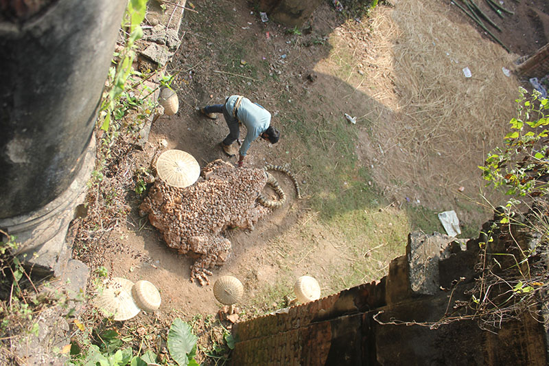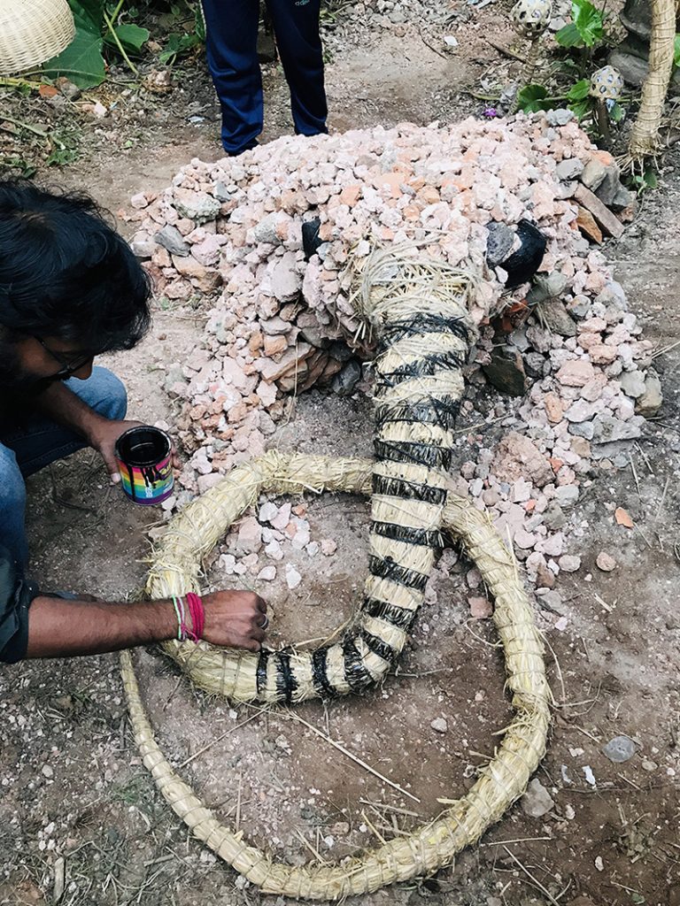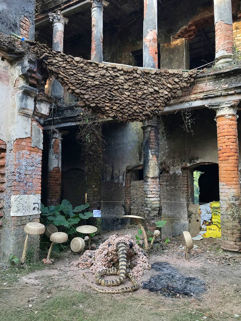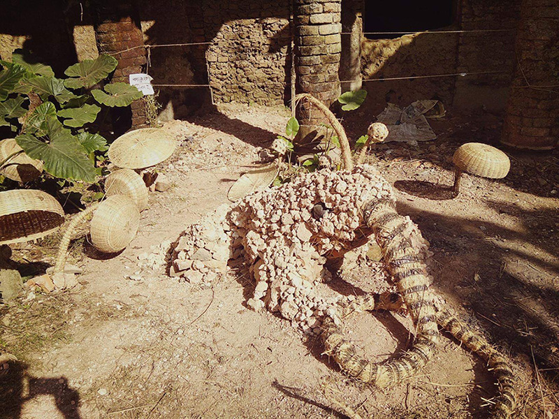 The most common myth story about the palace is that in this area the king saw a frog eating a snake and he took that as a good sign on the site and decided to built the palace here. Then in reality the most living creature is the bees. So combining these existences Rangajib created a installation of a frog with a snake in mouth and a giant bee-house in collaboration with local village boys. Artist took all the existing shapes and pieces around and assembled together in the most organic possible way.