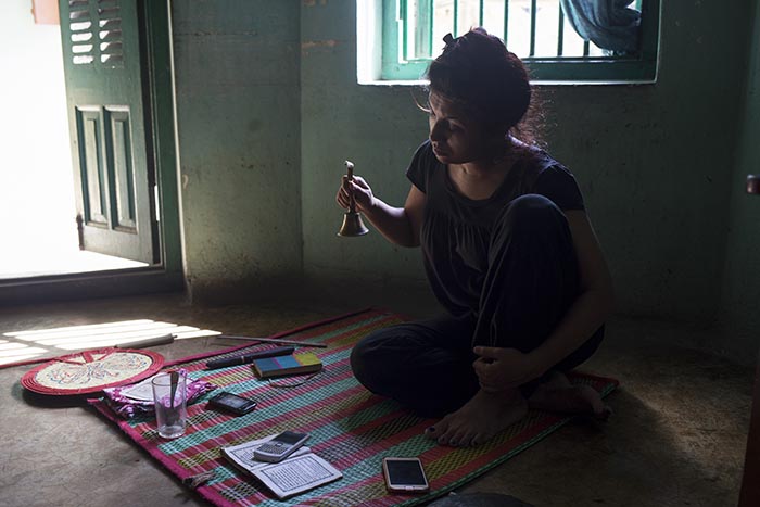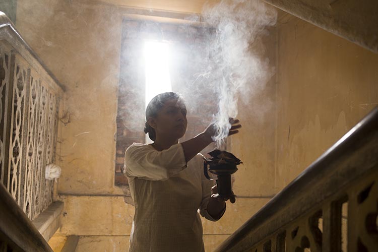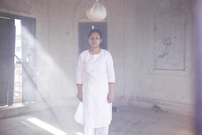The 7 hours long performance by artists started in morning from the prayer room of the Hindu family who are the owner of the building now, then continued till afternoon where artist created a mesmerizing atmosphere by creating live sound, making smoke and the gesture of her body. She created various unknown sounds from a hideout and appeared suddenly and ended up into dust in the dome on top of the building. She collaborated with Sze for the sound installation and live sound making.