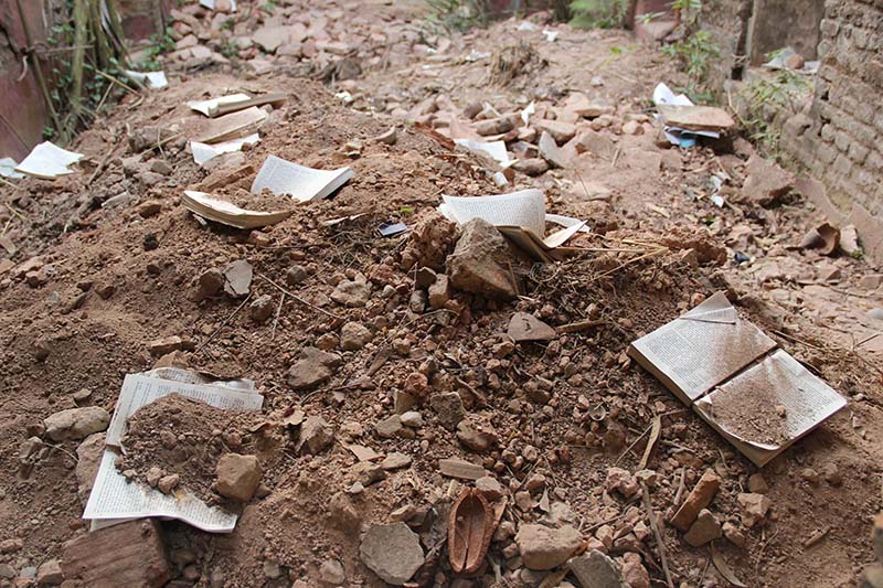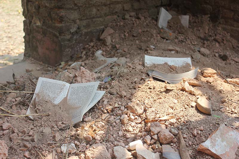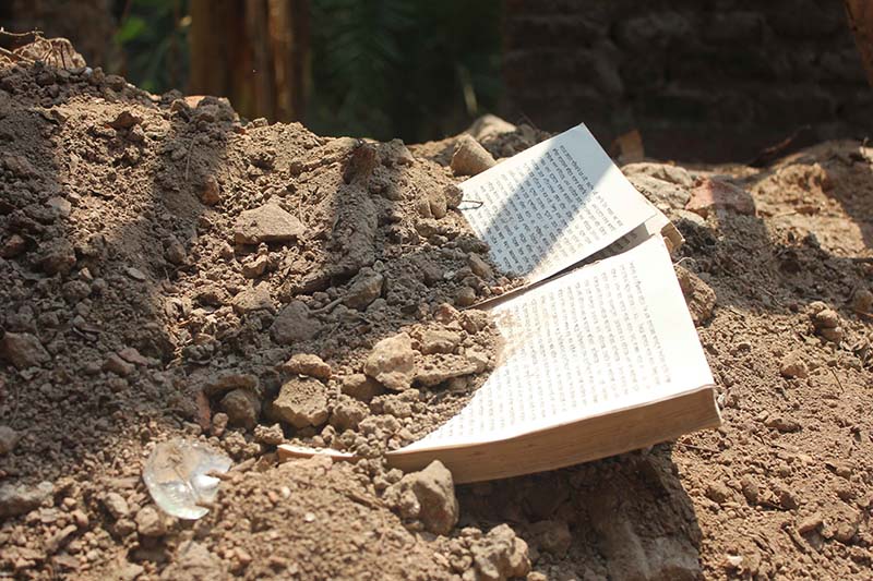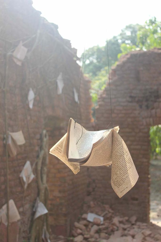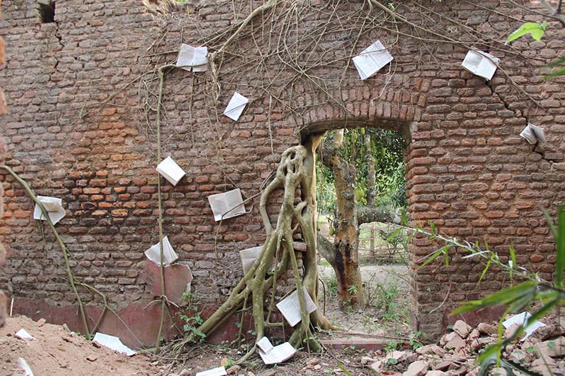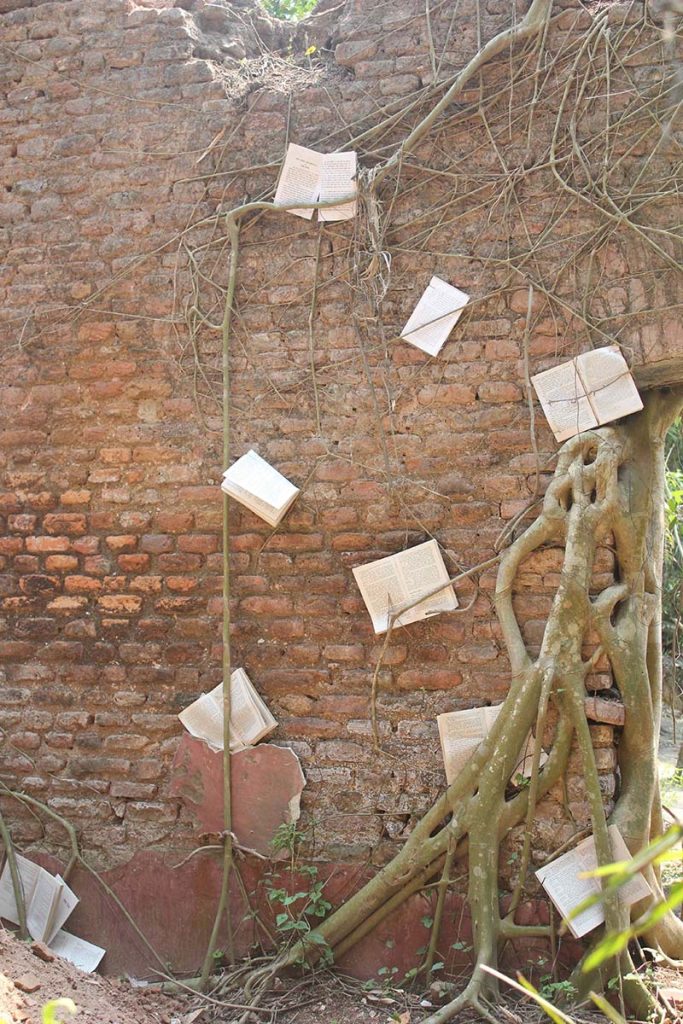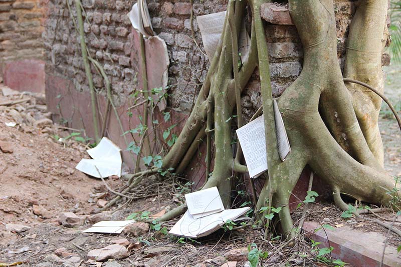 We can see that nature devoured the library. There is no trace of a library or books rather trees and broken walls. Here the artists attempted to recreate the library with the help of school going students. They asked each student to bring one book that they won’t need in the future. The students came with books but they were not psychologically prepared to leave their books on such a place. They could not imagine this place a library that doesn’t have a roof. Then the artists came to a realization that the library was dead that can’t be a library of books anymore. Later they made this place a graveyard of books as that seemed the ultimate and unfortunate fate of this place.