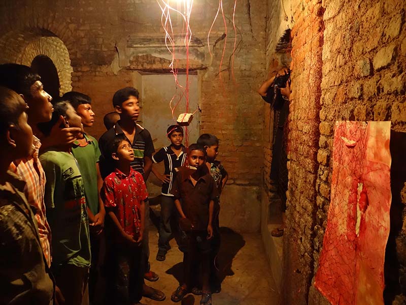 Indian Artist Mansi Trivedi came all the way to Shatkhira in the Third Episode of URONTO at Kalinanda Chattopadhayay’s House. The palace is almost 400 years old and only few walls and roofless rooms are standing on their last legs in present time. In every Episode Artists are encouraged to work with local traditional materials. In this work Mansi used the local fish net for her work which is very much available in an area like Shatkhira where fish business is a big business and all the materials related with fishing is very local and traditional there. Fishing is a common profession int hat area.