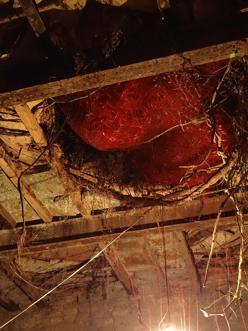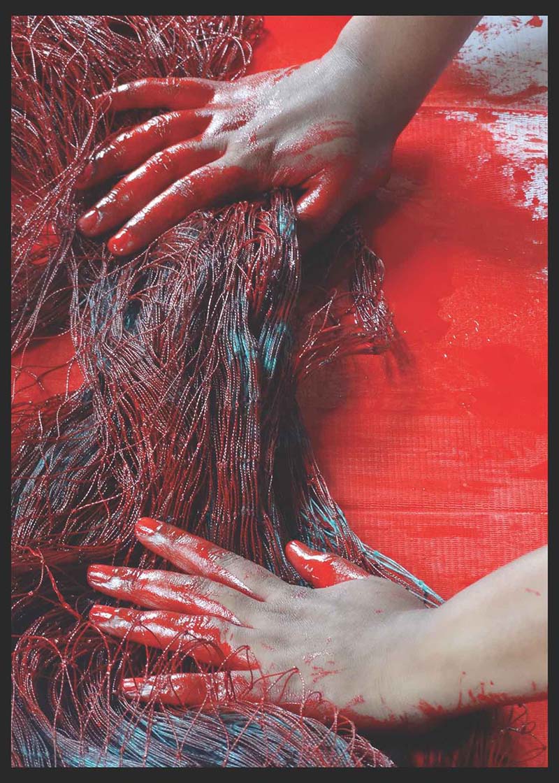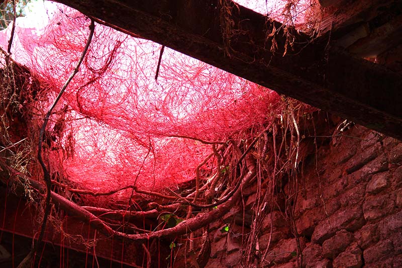 Trivedi colored the locally collected nets in to Red to create an alarming situation at the site also expressing that the house is in an alarming stage also she wanted to protect the fragile area with netting them around like people protect fruits on tree with net .