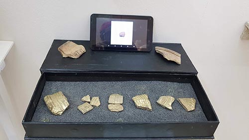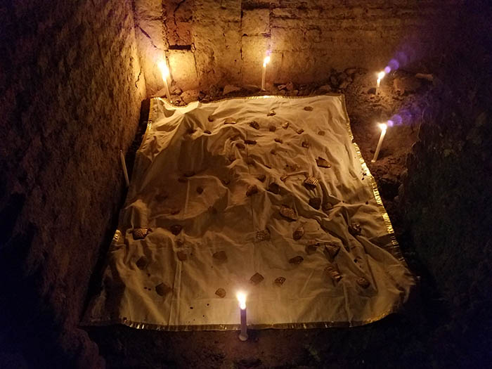 Having thus preserved the pieces he decided to fabricate a treasure, after which he laboriously hand painted each fragment gold. Concluding the exhibition on the island, Julian placed the golden fragments on a white display cloth and hid them in a secret passage under a stair case in the small palace. Illuminating the waist high chamber with candles and lit bunches of incense throughout the structures. After a time, a treasure hunt was declared and visitors could wander in search of the golden fragments. The treasure was soon discovered and the villagers quickly rushed to claim their own pieces in great excitement.