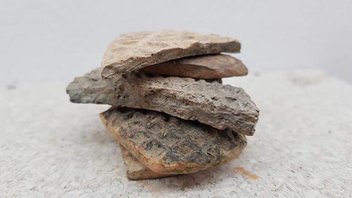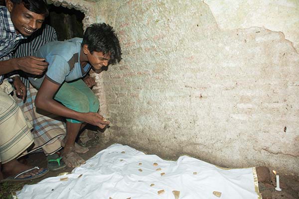 As part of the seventh episode of the project artist and curator Julian A. Jimarez worked with several artists including Tarak Das, Tanmoy Nandi, Dhannajay Kumar, Emran Sohel, and Baloram Debnath on collecting oral histories of the palace from the local villagers. One recurring subject across stories was the presence of a buried treasure. Looking at the village and at the site, it was clear that the real treasure was all around the villagers, but perhaps out of sight. Walking around the small island Julian noticed small clay fragments embedded into the walking paths (Shukair is a small alluvial island with no roads, mostly accessible by boat).