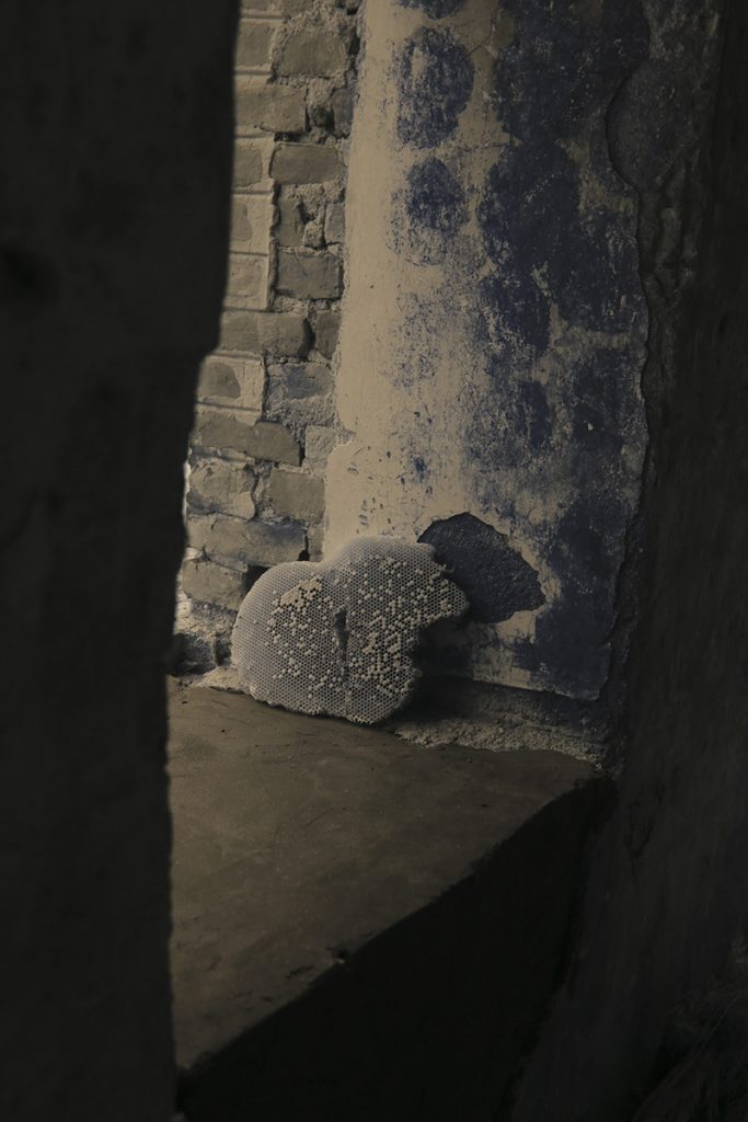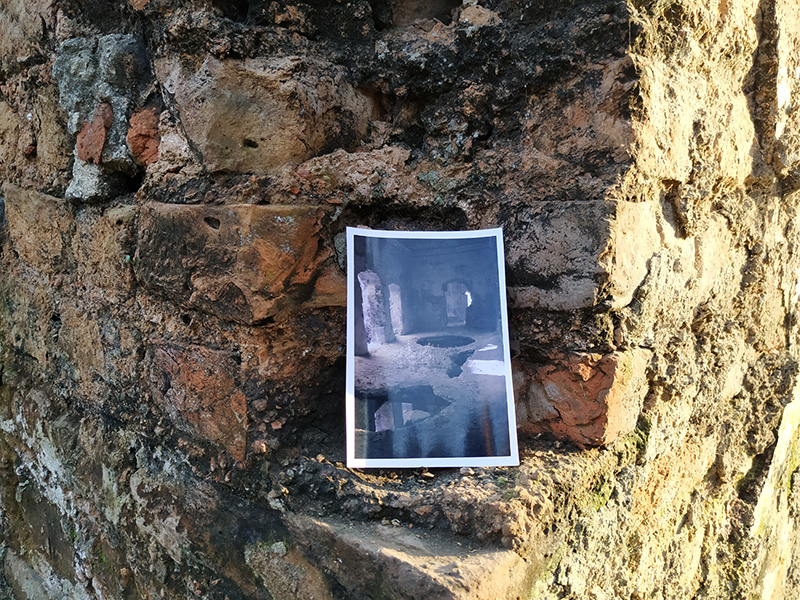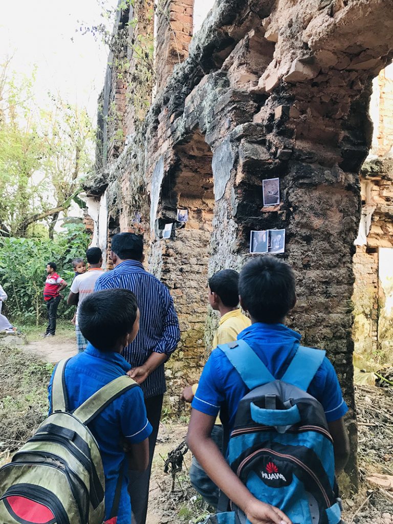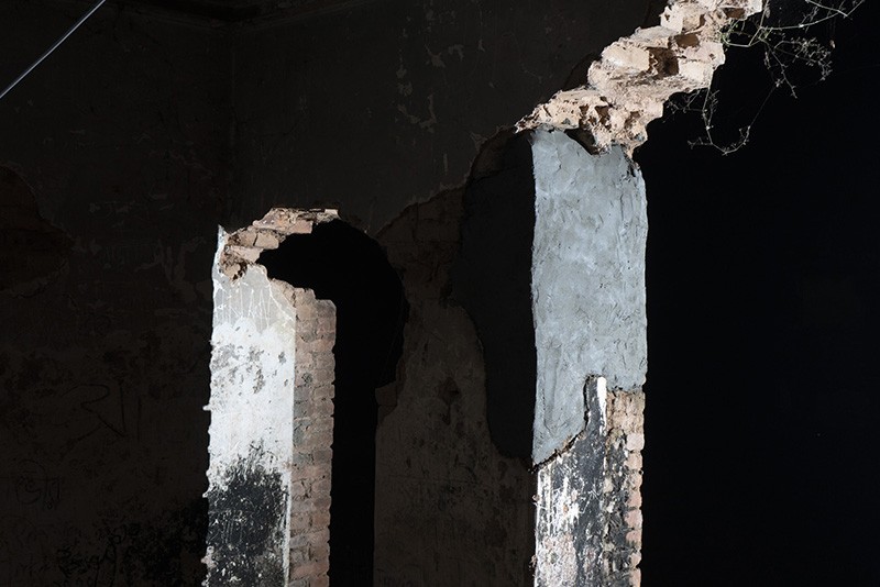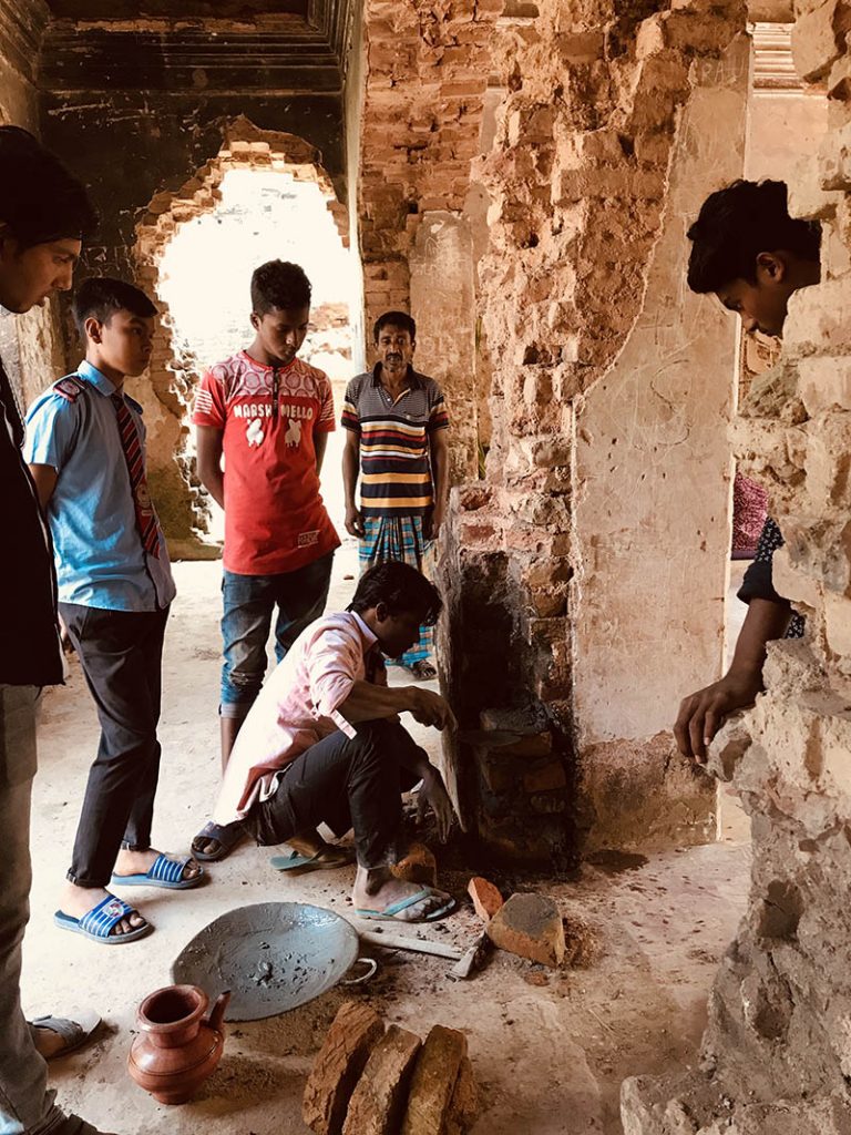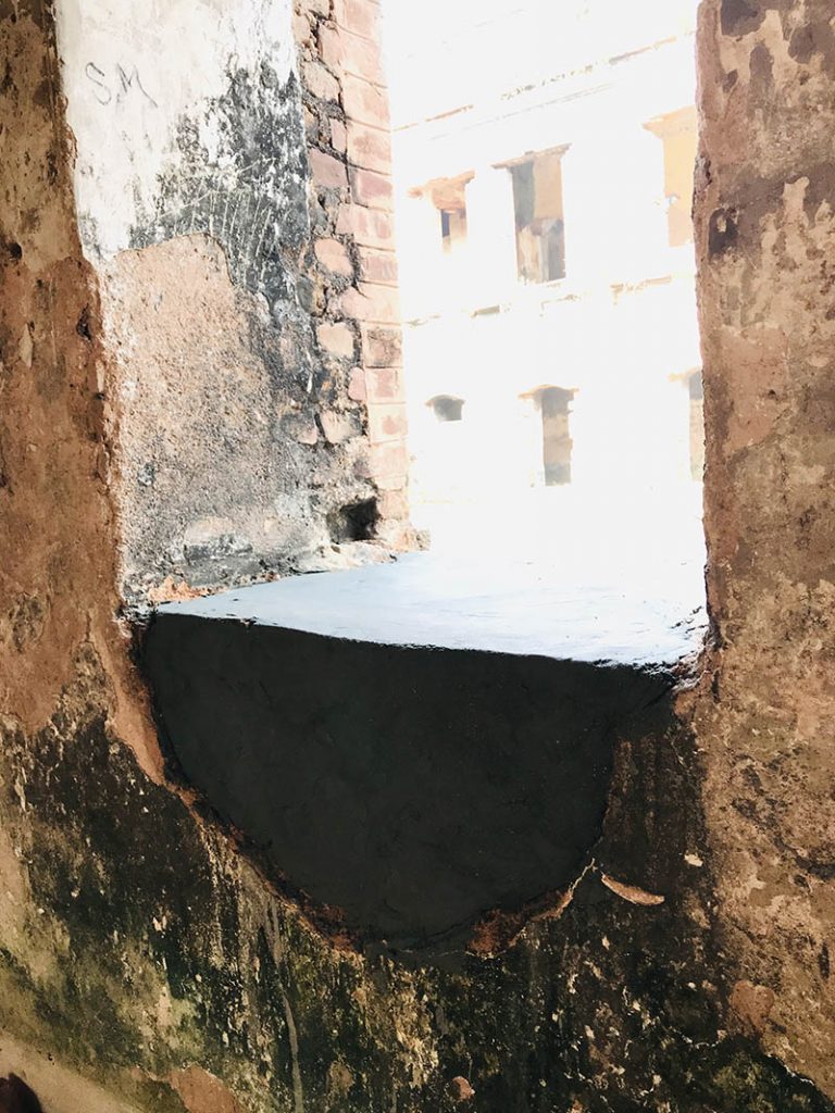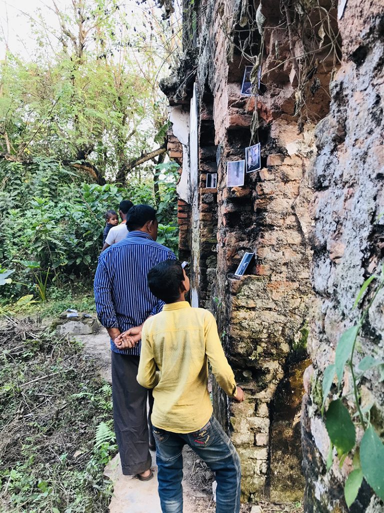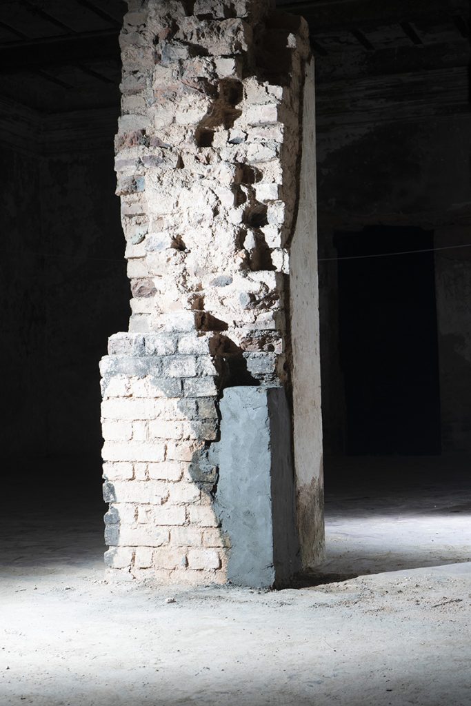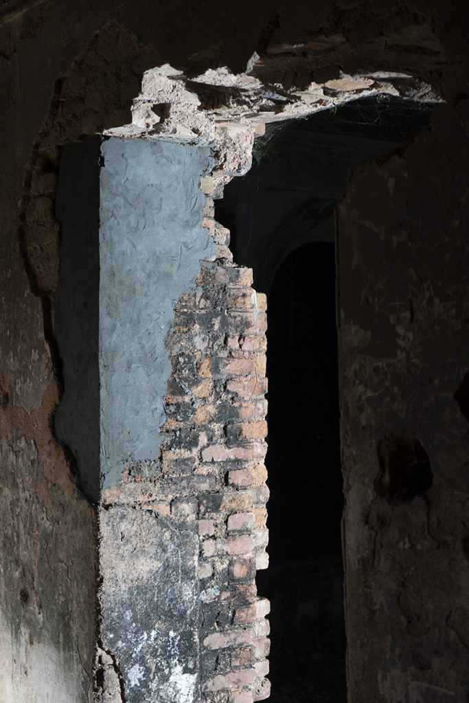 The Rajbari (The Dubolhati Palace) belongs to itself before belonging to anyone else. A living, breathing structure, eaten away by time. Nabil’s work treats the structure as a wounded body in need of help. Cement and bricks as bandages, giving back instead of taking away. Skin grafting by using old bricks.