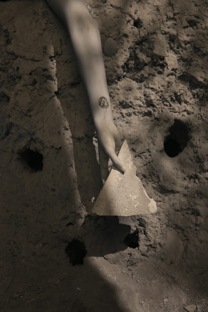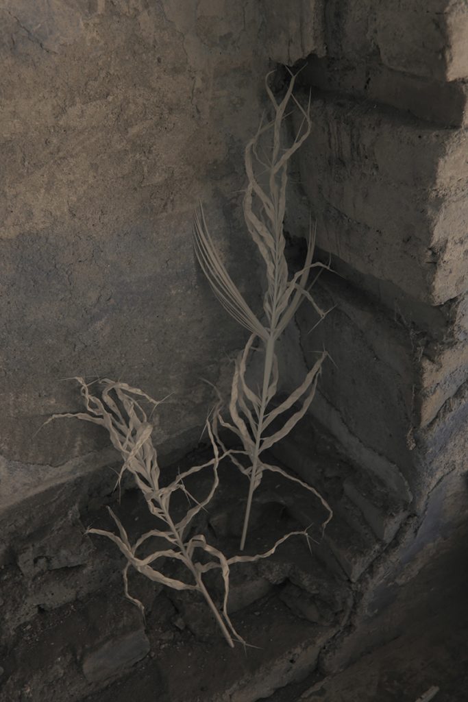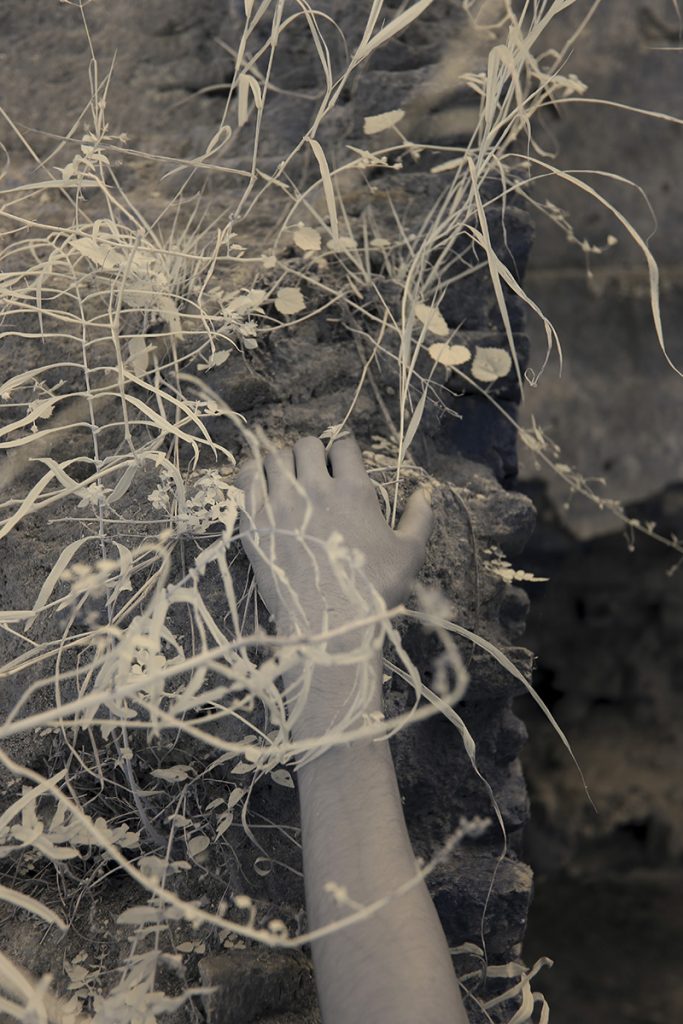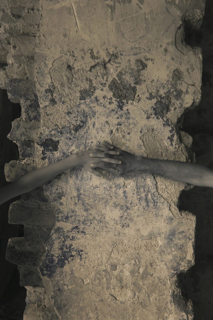 Hands and plants superimposed against the wall as well as in the cracks to remind others that the home still feels. It cares very little about who it belongs to.