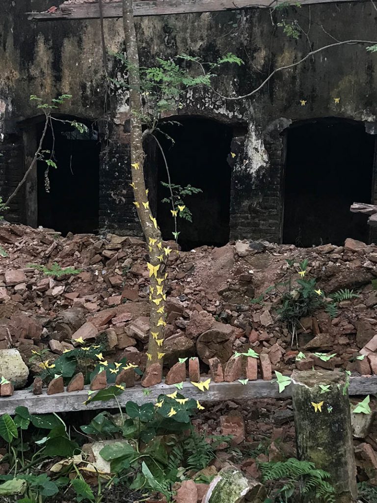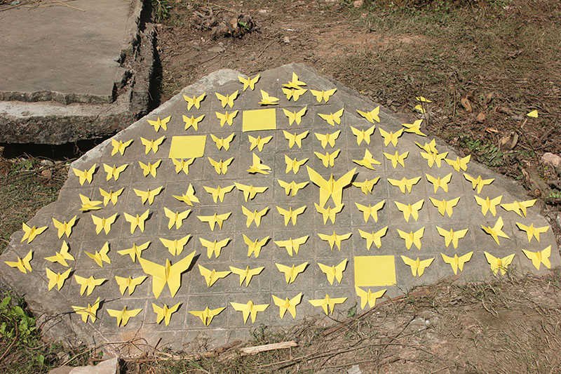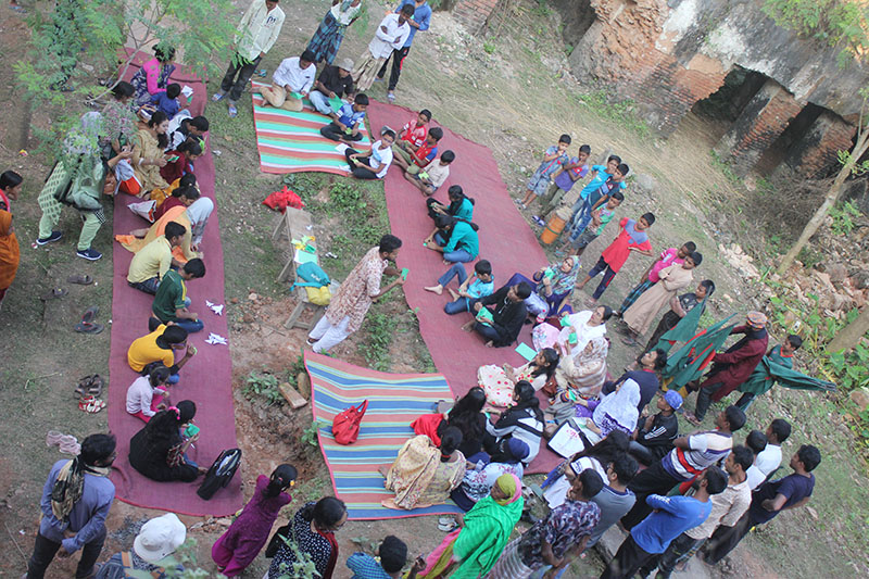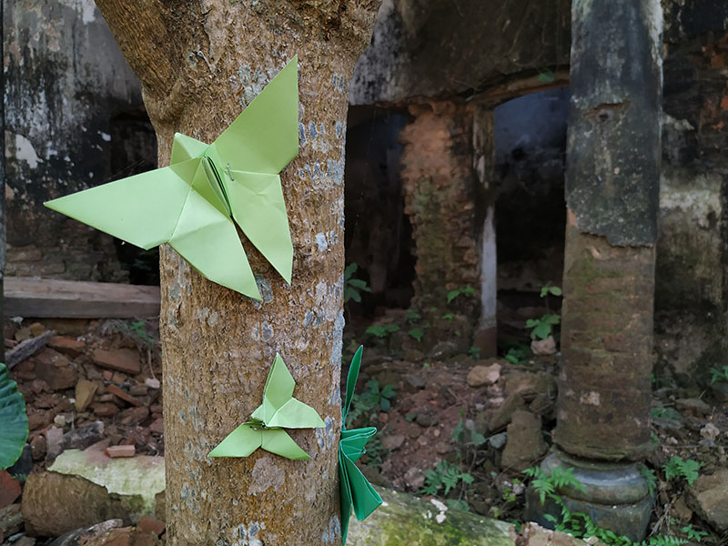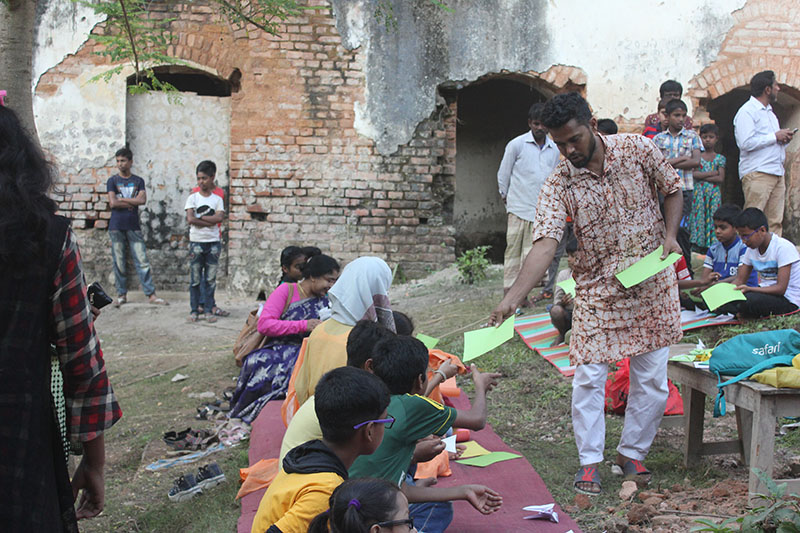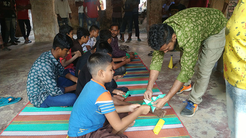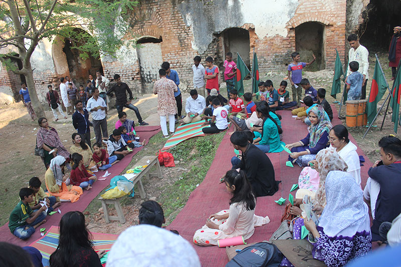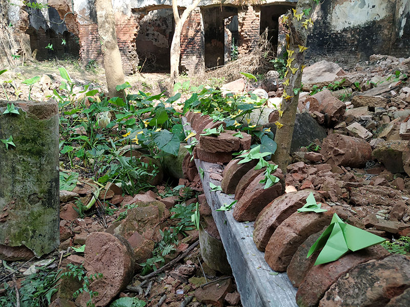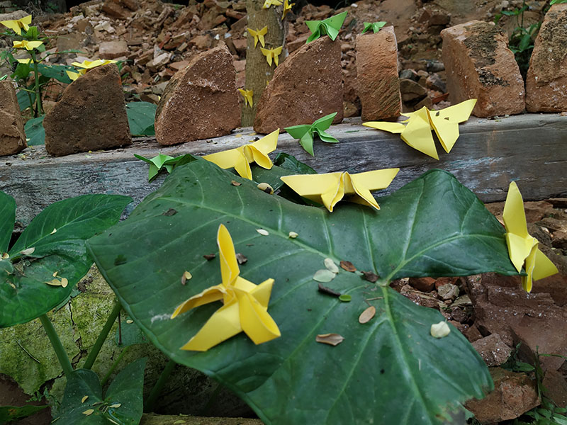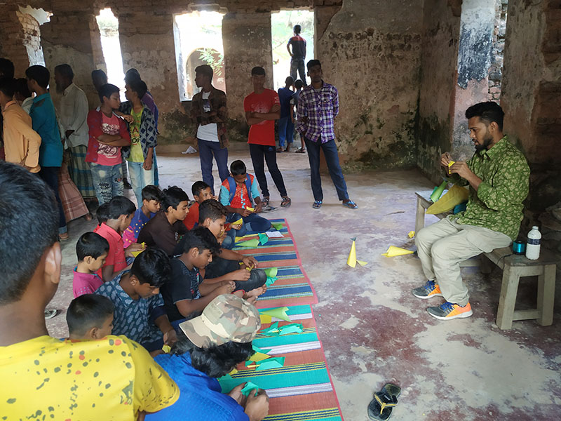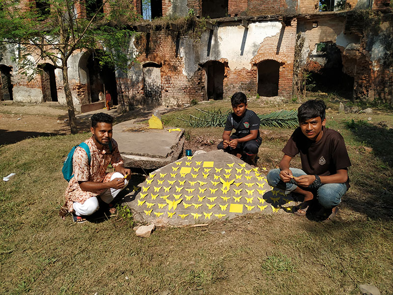 The participants in the workshop were community people of all age, local kids from Dubolhati village, school students and kids from local cultural society in Naogaon city also the artists of Uronto who were part of the residency during then. Participants learned about basic folding and unfolding of paper, adopted skills to create various animal, insects, whistle, boxes etc. Then following the learning they were creating stories around the Dubolhati palace where origami objects like butterfly, grasshopper, flowers etc became part of the nature and the surrounding in various composition.